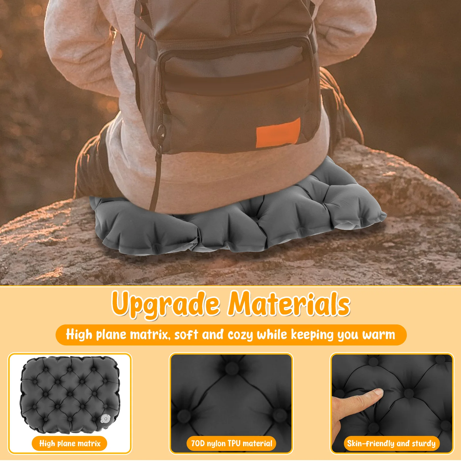 Wear and Tear Resistant: The inflatable seat cushion features 2 different texture on both sides which may be slightly uneven when inflated but will restore over time. The surface layer adopts high density nylon tpu, soft and skin friendly. The 70D nylon TPU texture features excellent abrasion and tear resistant performance